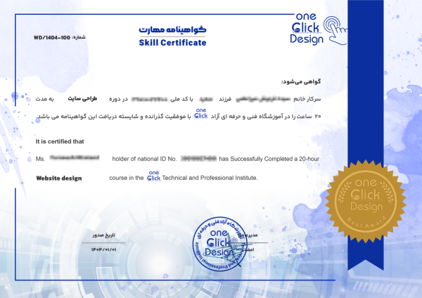 فرصتی استثنایی برای علاقمندان به دوره‌های کسب‌وکار در آموزشگاه وان‌کلیک‌دیزاین. پس از گذراندن دوره آموزشی و ارائه طرح پایان دوره (ارائه پروژه نهایی مدرس)گواهینامه پایان دوره از مجموعه وان کلیک دیزاین دریافت می کنید و قابلیت ترجمه رسمی و به عنوان یک دوره معتبر شناخته می شود.اگر به‌دنبال دوره‌ای جامع و حرفه‌ای هستید که پس از پایان آن بتوانید مهارت‌های خود را در سطح جهانی ارائه دهید، شرکت در دوره های کسب‌و‌کار مجموعه ما  بهترین انتخاب برای شما خواهد بود.